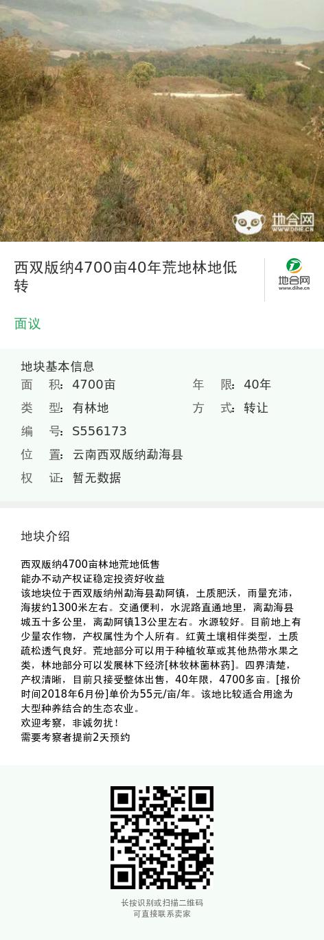 该地块位于西双版纳州勐海县勐阿镇,土质肥沃,雨量充沛,海拔约1300米左右。交通便利,水泥路直通地里,离勐海县城五十多公里,离勐阿镇13公里左右。水源较好。目前地上有少量农作物,产权属性为个人所有。红黄土壤相伴类型,土质疏松透气良好。荒地部分可以用于种植牧草或其他热带水果之类,林地部分可以发展林下经济[林牧林菌林药]。四界清楚,产权清晰,目前只接受整体出售,40年限,4700多亩。[报价时间2018年6月份]单价为55元/亩/年。该地比较适合用途为大型种养结合的生态农业。